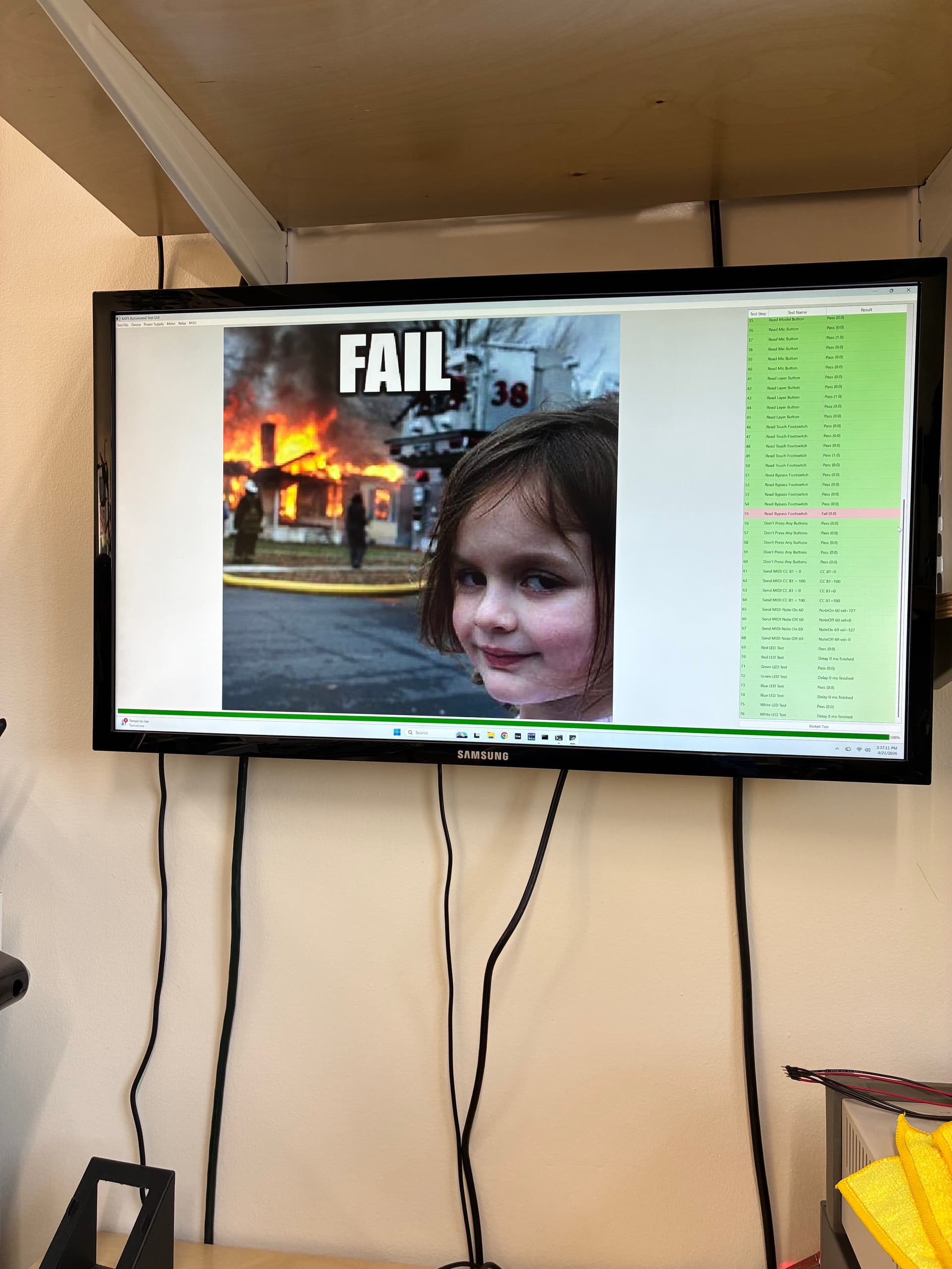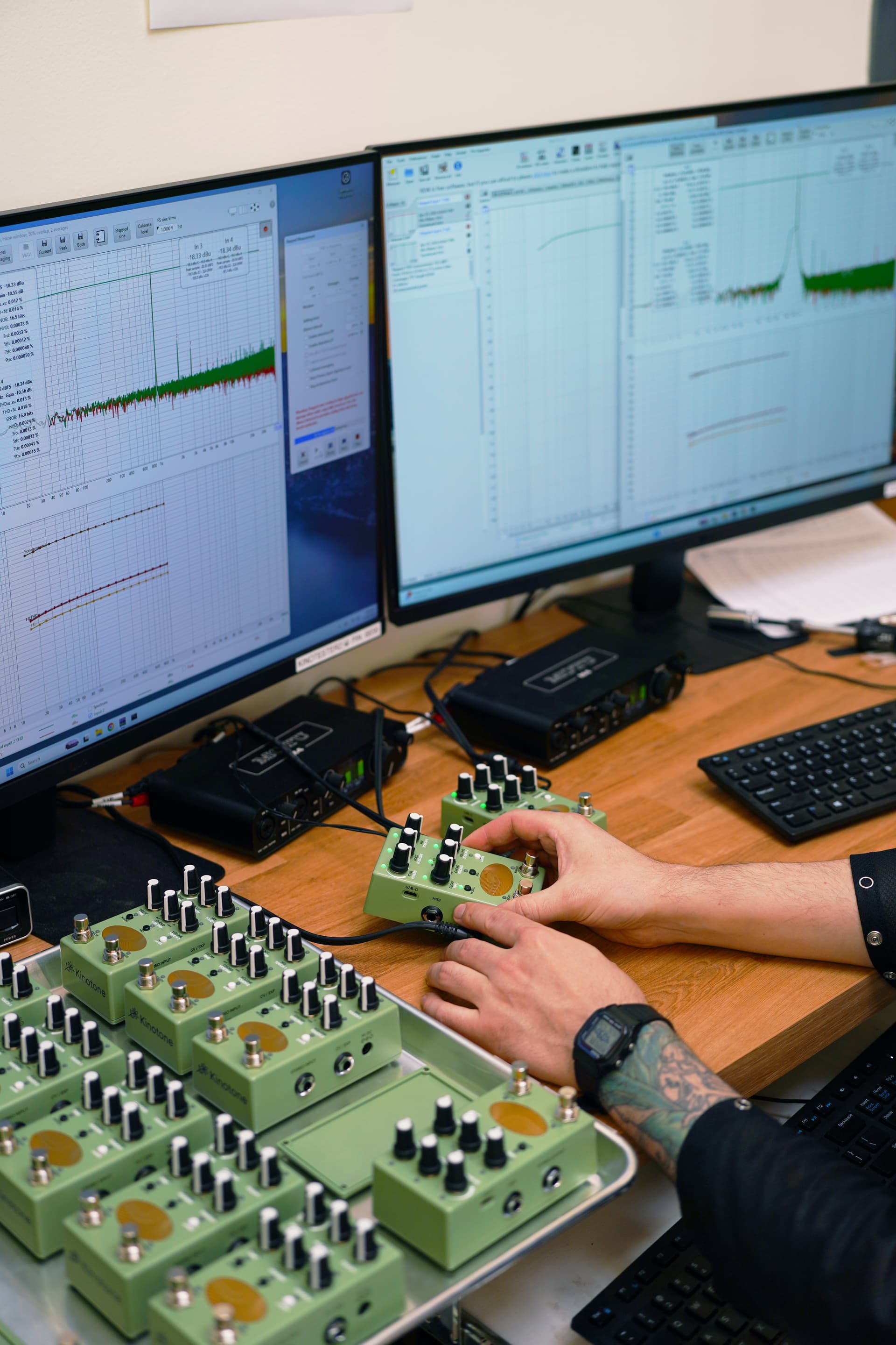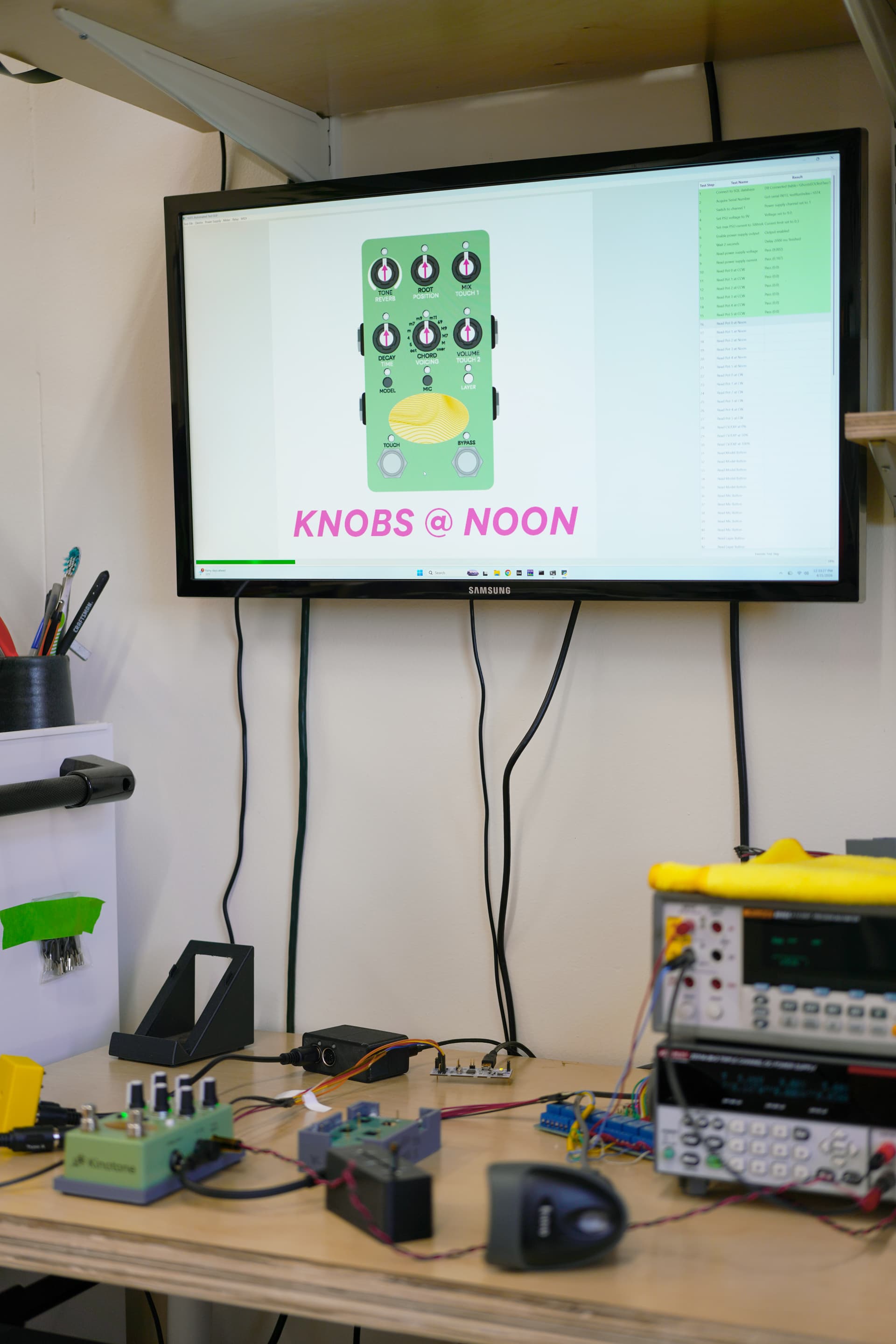 Functional testing with KATS (Kinotone Assisted Testing System) - this step measures every pot, button, footswitch, LED, and both the MIDI and CV circuits